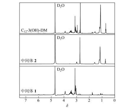 图1、图2为双子表面活性剂的红外光谱图。由图1可知,目标产物通过中间体1和中间体2的对比已反应合成,目标产物C12-3(OH)-DM中3357cm-1为—OH的伸缩振动吸收峰,3010cm-1为不饱和双键氢C=C—H的伸缩振动吸收峰;2921cm-1、2851cm-1为饱和甲基和亚甲基C—H的伸缩振动吸收峰;1726cm-1为酯基上C=O键伸缩振动吸收峰;1637cm-1为C=C的伸缩振动吸收峰;1472cm-1为C—N的伸缩振动吸收峰;1380cm-1、1326cm-1分别为甲基和亚甲基的弯曲振动吸收峰;1262cm-1为酯基上C—O的伸缩振动吸收峰,这些峰的存在说明红外图谱与C12-3(OH)-DM分子式中的基团一一对应。图2显示,3种双子表面活性剂均已合成。