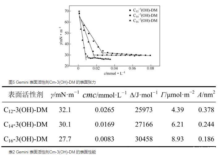 图5为Gemini表面活性剂Cm-3(OH)-DM的表面张力随浓度变化图。由所制双子表面活性剂的表面性能数据所示。溶液的表面张力随着表面活性剂浓度的增加而迅速降低,直至达到平衡,且能在低浓度时即可显著降低水的表面张力。并且C12-3(OH)-DM(32.1mN/m)、C14-3(OH)-DM(30.1mN/m)和C16-3(OH)-DM(27.7mN/m)的最低表面张力值比对应的单子阳离子表面活性剂C12TACl(39mN/m)、C14TACl(38mN/m)和C16TACl(40mN/m)低得多[1-2,24],且其临界胶束浓度分别为0.0265mmol/L、0.0169mmol/L、0.0083mmol/L比对应的单子表面活性剂低一到两个数量级。因此,所合成的双子表面活性剂是一种非常高效的表面活性剂。表2列出了Gemini表面活性剂Cm-3(OH)-DM的表面性能。