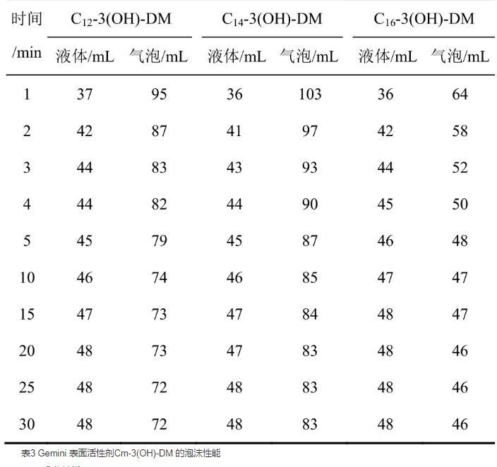 表3 Gemini表面活性剂Cm-3(OH)-DM的泡沫性能