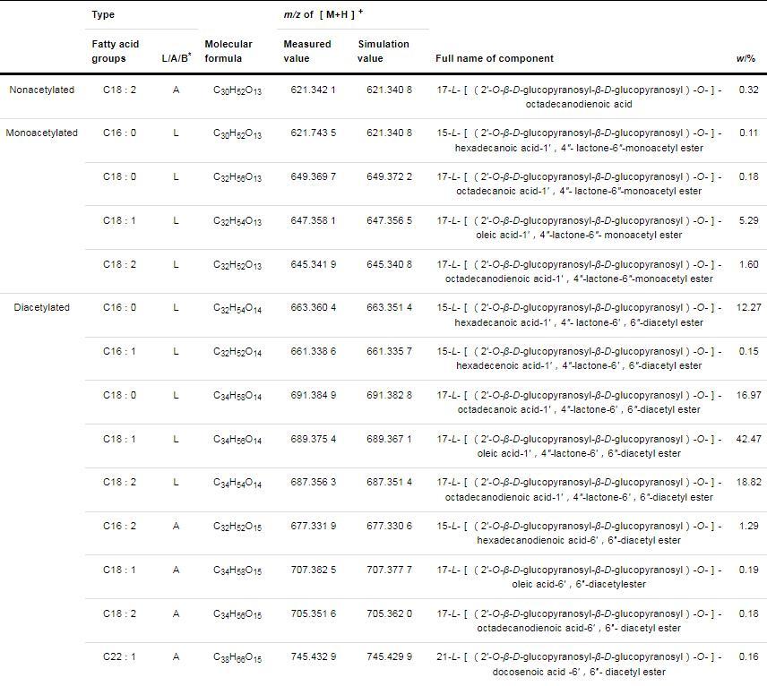 表1乙酰化SLs同系物组分和质量分数(Continued from previous page)