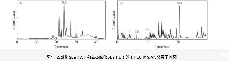 图1乙酰化SLs(A)和去乙酰化SLs(B)的HPLC-MS/MS总离子流图