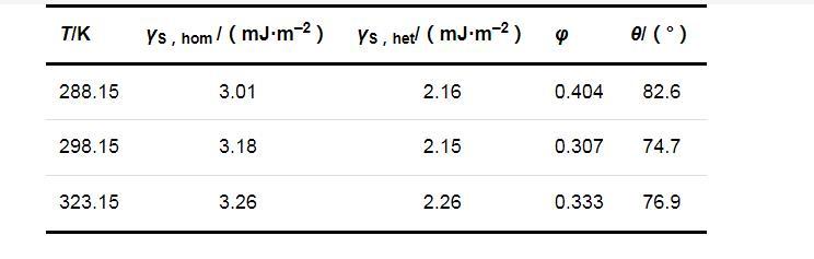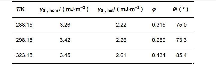 两种成核机制时的固-液界面张力(γS,hom和γS,het)、形状因子(φ)和接触角(θ)的计算结果列于表2.可以看出,在同一温度下,均相成核时的固-液界面张力大于非均相成核时的固-液界面张力;温度对固-液界面张力的影响并不明显,固-液界面张力只随温度的升高略有增加.
