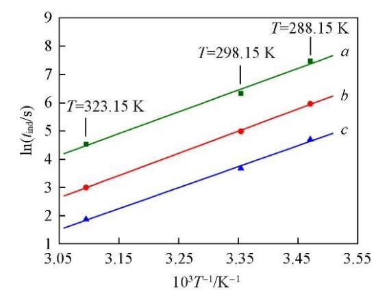 将图1与图4对比可知,添加NaCl后Li2CO3的成核诱导期明显增长,说明体系中过量Cl‒的存在抑制了Li2CO3的成核.用图4中的实验数据回归了式(8)中的参数数值,结果列于表3.由回归的参数数值可知,过饱和度对诱导期的影响仍然是在较低的温度下更为显著.