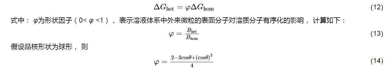 式中:θ为晶核与外来固态杂质之间的接触角(0°≤θ≤180°),反映晶核与外来杂质之间的亲和程度,从而决定外来杂质对初级成核的影响.