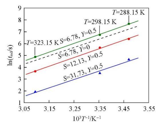 分别在288.15,298.15和323.15 K时研究了NaCl的添加对Li2CO3成核诱导期的影响,每组实验均在Cl‒的超额含量(Y=0.5)的条件下进行,结果见图4.可知,在同一温度下,Li2CO3的成核诱导期仍然随过饱和度的增大而缩短;在同一过饱和度下,Li2CO3的成核诱导期随温度的升高而缩短,而且在添加NaCl(Y=0.5)后,温度对Li2CO3成核诱导期的影响比未添加(Y=0)时更为显著.如,在过饱和度S=5.76,温度从288.15 K升高到323.15 K时,添加NaCl后Li2CO3的成核诱导期缩短了73.01%,而未添加NaCl时Li2CO3的成核诱导期缩短了67.89%.
