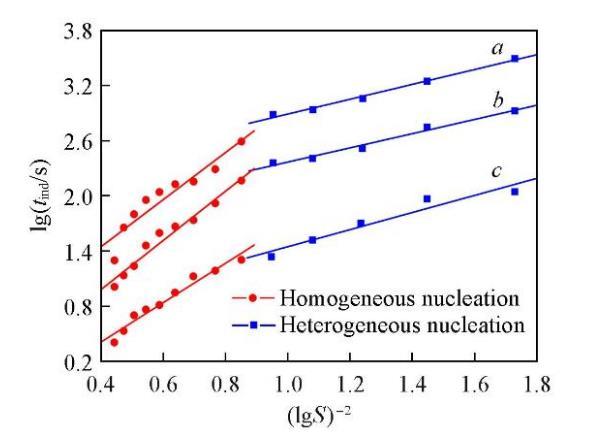 诱导期与初始过饱和度之间存在着很强的依赖关系.当初始过饱和度足够高时,成核可认为是均相的;当初始过饱和度足够低时,成核则以非均相为主[37].在恒定温度下,由晶体成核过程中的lgtind对(lgS)‒2作图可得两条斜率不同的直线,分别对应着两种不同的成核机制,即初级均相成核和初级非均相成核[37].由不同温度时Li2CO3的lgtind对(lgS)‒2作图,结果如图3所示.可知,成核机制的变化引起了直线斜率的改变,均相成核对应的直线斜率明显大于非均相成核时的直线斜率(Bhom>Bhet).在较低的过饱和度时,成核以非均相成核为主;而过饱和度增大到12.13以后,成核则以均相成核为主.