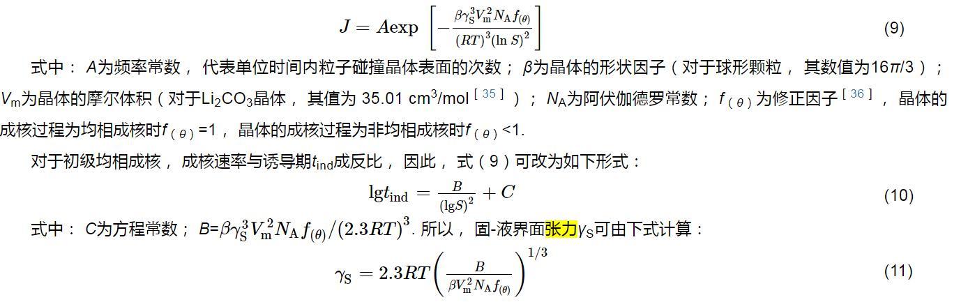 为了更深入地研究Li2CO3的成核过程,将以Li2CO3晶核与周围溶液间的固-液界面张力为切入点来探讨其成核机制.